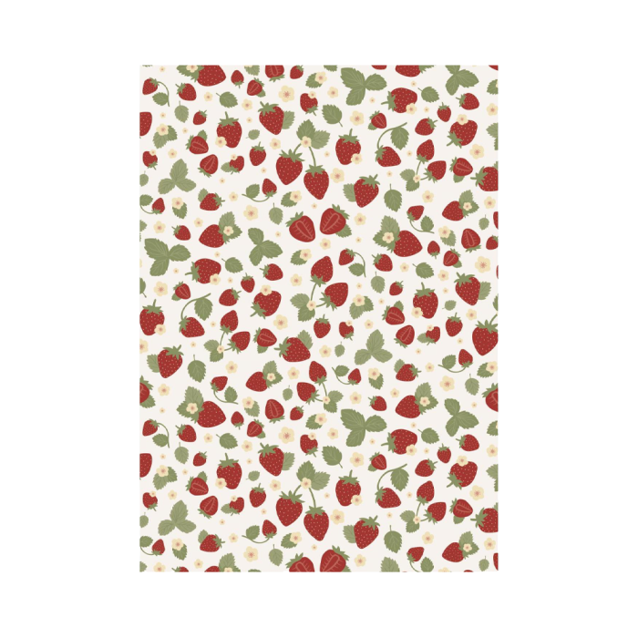 Dette gavepapir med jordbærmotiv bringer en frisk og sommerlig stemning til enhver indpakning. Det fine design er fyldt med røde jordbær og grønne detaljer, som giver papiret et sødt og livligt udtryk, der passer smukt til alt fra fødselsdagsgaver til små opmærksomheder i hverdagen. Papiret er fremstillet af 100 procent genbrugspapir i en god, tyk kvalitet, som gør det både bæredygtigt og praktisk at arbejde med.