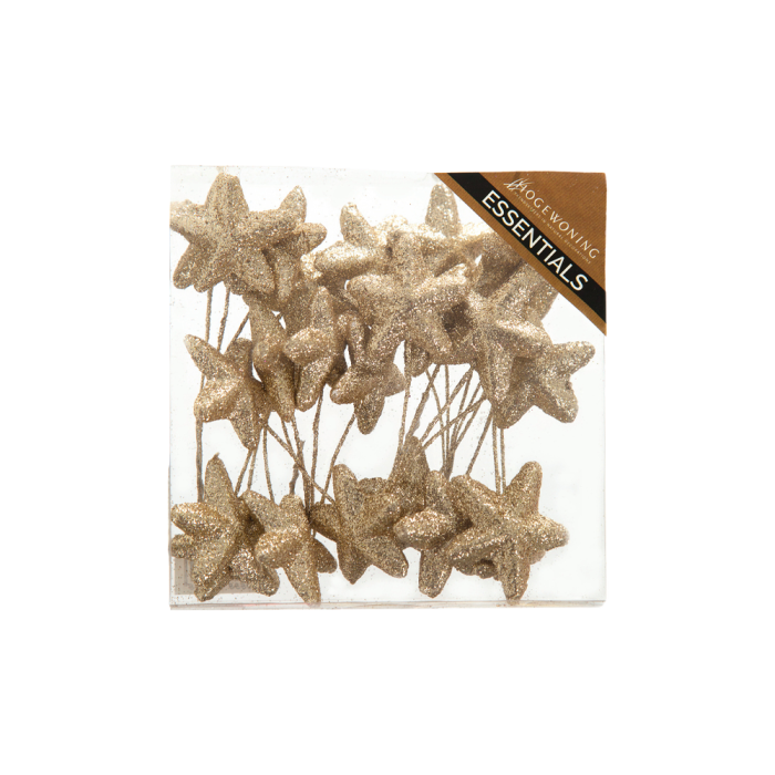 Glitterstjerner guldfarvede, de sidder på en 13 cm lang wire.. Her er glimmer, fest og farver med disse dekorationsstjerner. Kan indgå i festlige dekorationer eller som en del af bordpynten hele året. I æsken er der 6 klynger med 5 glitterstjerner i hver. I alt 30 glitterstjerner.