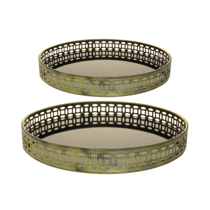 Set of two gold and black trays with mirrored bottoms. Can also be used as candle holders, where the mirrors create a beautiful effect.