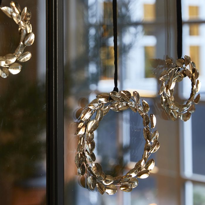 Beautiful metal leaf wreath from Speedtsberg in antique gold. Decorative, for example, hanging as a window decoration or lying as a table decoration. The leaf wreath is also available in a smaller version and as a ball.