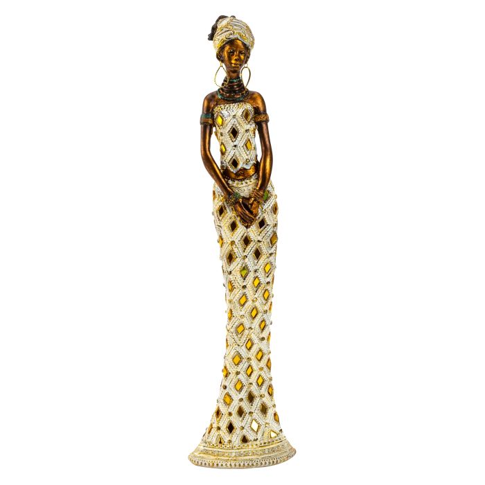 Afrikansk dam. Bronsfärgad figur med afrikanskt inspirerade kläder och smycken. Figuren är 33 cm hög.
