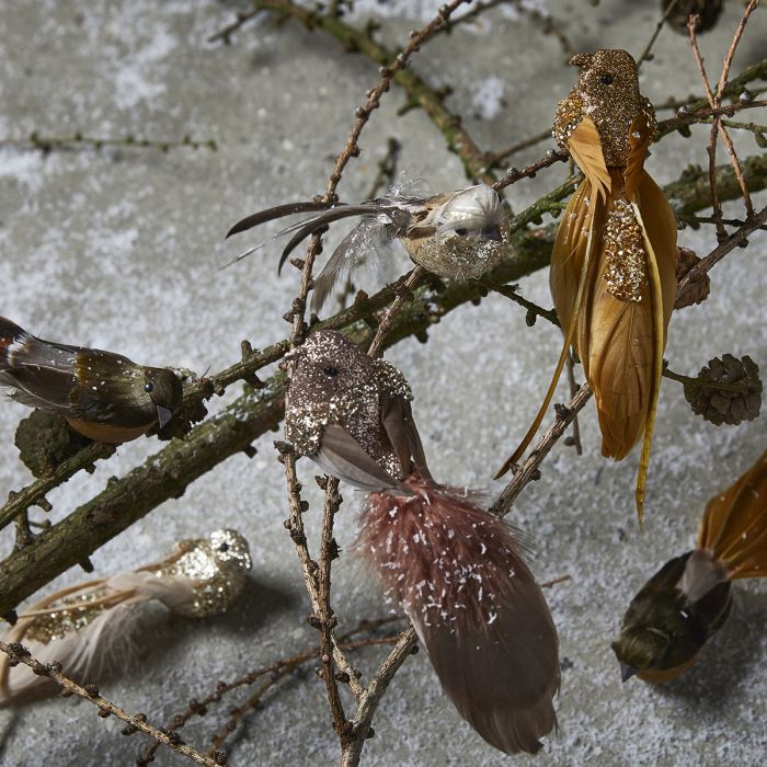 Vacker och dekorativ fågel i bruna nyanser och med en fin fjäderklädd svans. Fågeln kan dekorera både sommar och vinter och givetvis även på julgranar och grenar. Fågeln är från Speedtsberg. Säljes blandat.
